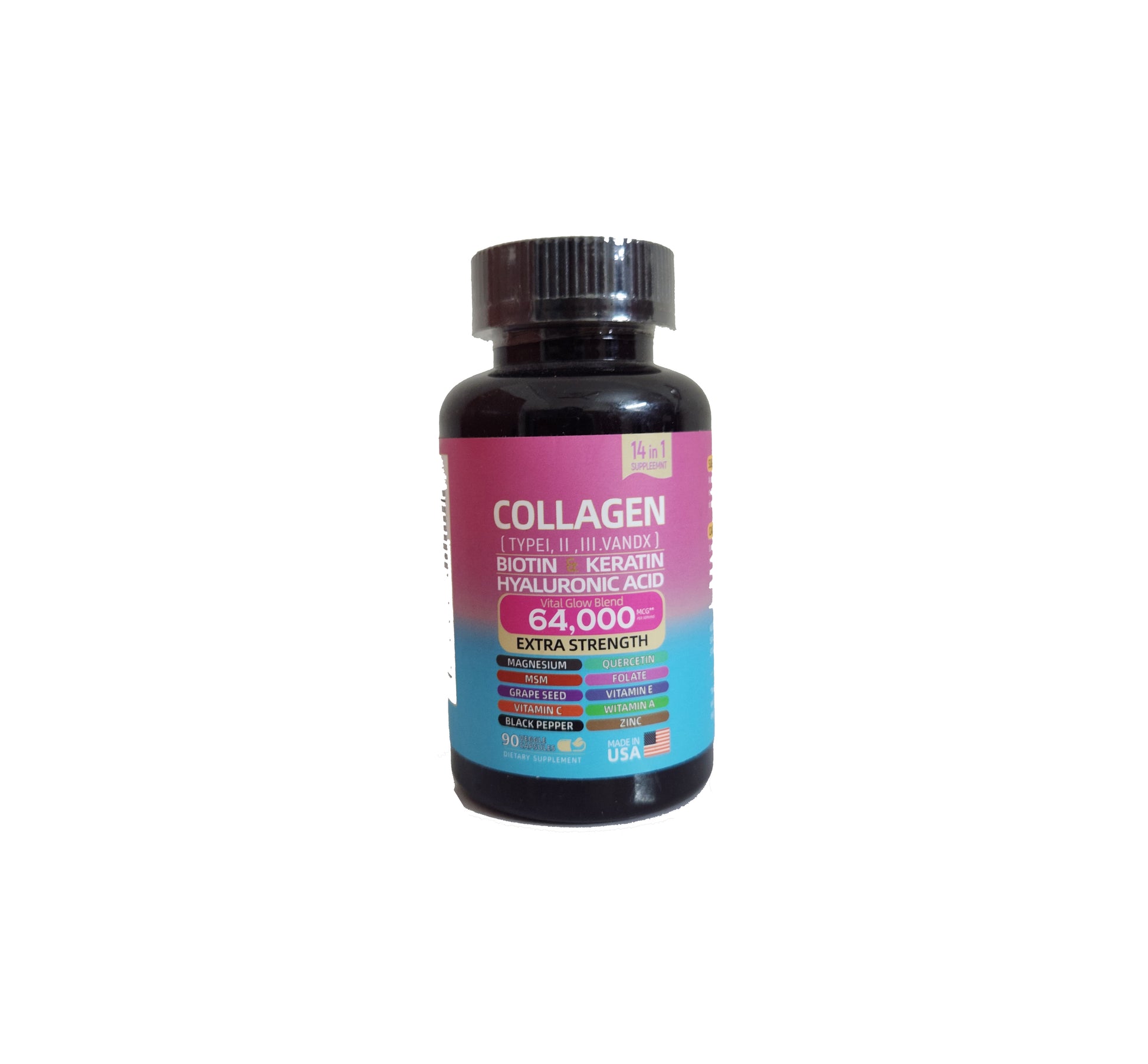 - Introducing our revolutionary 14-In-1 supplement, a comprehensive combination of Collagen Types 1 2 3 5 and 10, Biotin, Keratin, Hyaluronic Acid Capsules, enriched with 14 potent ingredients. Collagen Pills are an all-natural beauty supplement containing collagen peptides, vital proteins collagen peptides and biotin, and keratin for skin health a supplement for women and men alike. Experience the power of Grape Seed Extract, Quercetin, Magnesium, Zinc, and many more in one convenient formula.