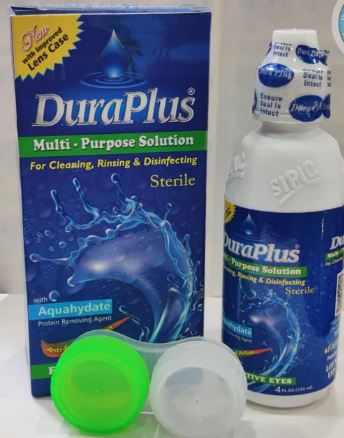 Dura Plus Lens Solution- 120 ml used for cleaning and caring for soft contact lenses; premium quality and familiar to people.