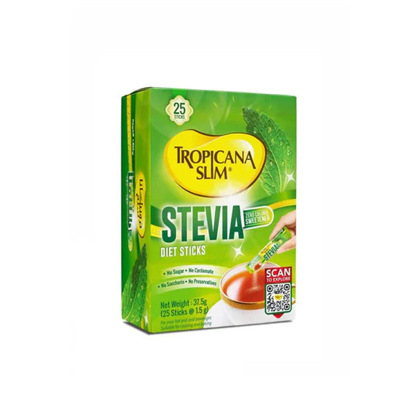 Tropicana Slim Stevia Zero Calorie Sweetener Sticks is made from high-quality stevia extract offering a natural, sugar-free alternative to regular sweeteners. It helps to control calorie intake, also maintains blood sugar levels and body weight,t and prevents diabetes. It is free from sugar, calories, artificial sweeteners, gluten, dairy, preservatives, and artificial colors.